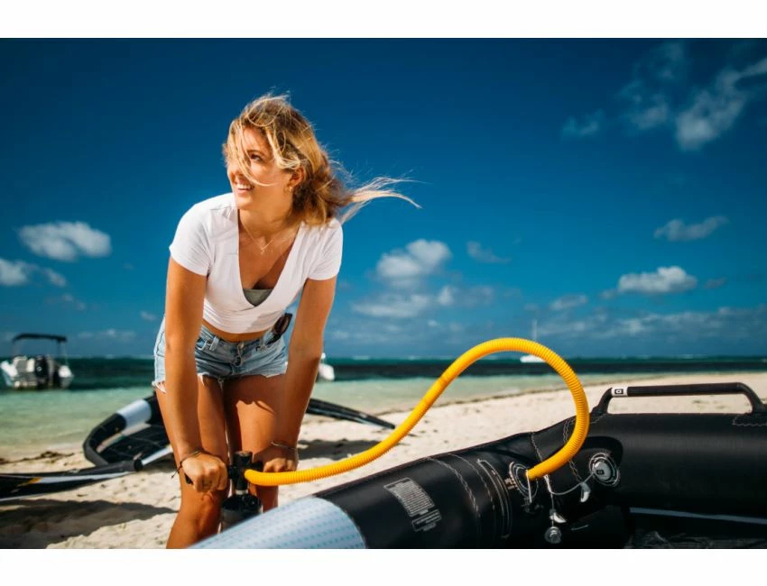 de pompe rapide avec un diamètre plus grand pour un dégonflage et un gonflage rapides. Elle a aussi 2 valves indépendantes pour un meilleur contrôle de la pressions des boudins. Ses deux fenêtres PVC renforcées sur l’aile rendront vos manœuvres bien plus évidentes.