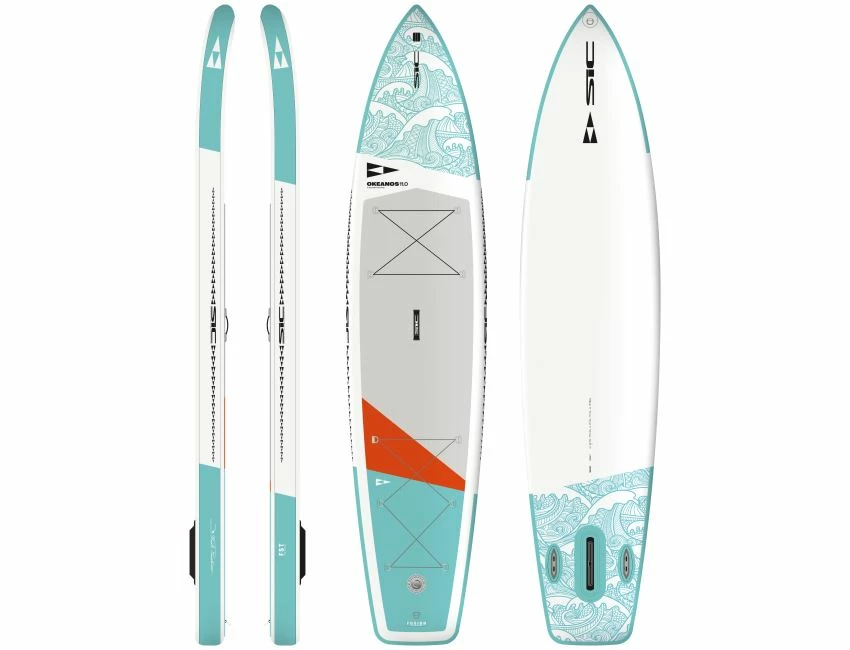 L’Okeanos est une board orientée fitness et touring. Nommée d’après le dieu Grec des océans et inspirée du bateau explorateur des fonds marins NOAA Ship Okeoanos Explorer, Okeanos est destinée aux pratiquants en recherche d’aventures et de découvertes, ou de pratique orientées fitness. Planche très populaire, SIC a créé une version gonflable de l’Okeanos en 2020. L’Okeanos est adaptée à tous les profils de rameurs et est particulièrement adaptée aux longues sorties. Sa construction FST en fait une planche très robuste, étudiée pour soutenir une charge lourde. On peut donc aisément sortir pour la journée en chargeant goûter, tente et sac sur le pont. Son thruster en fait également une planche très adaptable : on peut la rider en single, twin ou thruster, suivant la pratique et le plan d’eau choisi.
